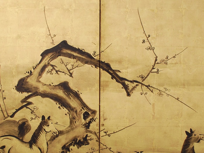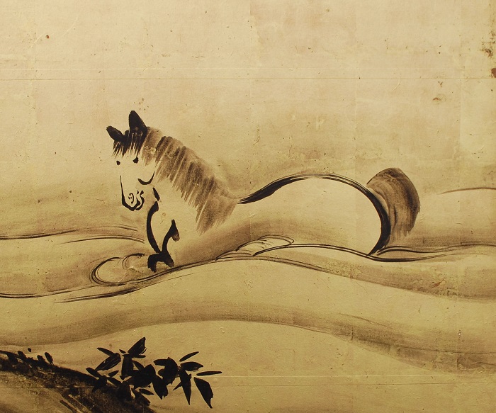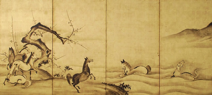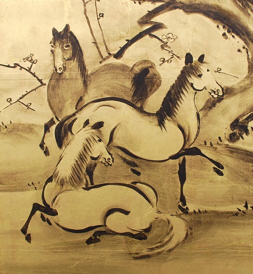 Antique Japanese screen-painting in sumi and gold leaf (kinpaku) on paper, depicting a herd of horses variously gamboling, reclining and wading along a shoreline beside a flowering plum, indicative of early spring, mounted as four panel screen (byōbu), with wooden molding. Origin: Japan Period: Edo/Tokugawa Period (1615-1868), Mid 19th Century Dimensions: 42.0 inches high x 96.0 inches wide Painting 4038 |