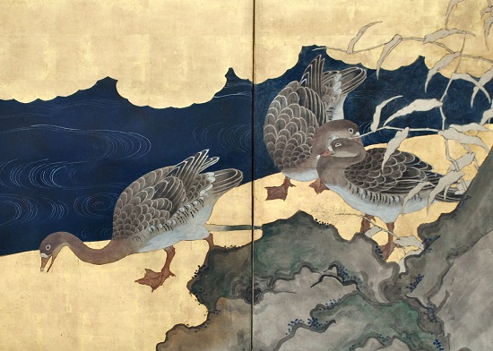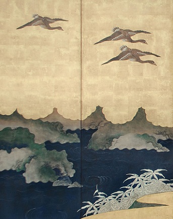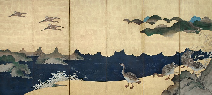 with textile border and wooden molding, depicting a flock of geese (kari) on a meandering beach, one