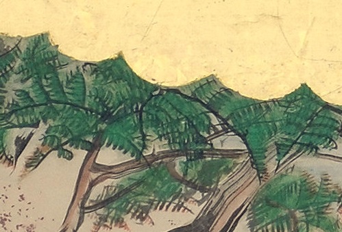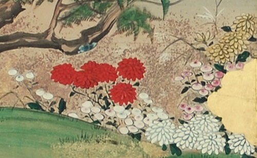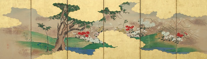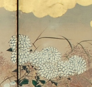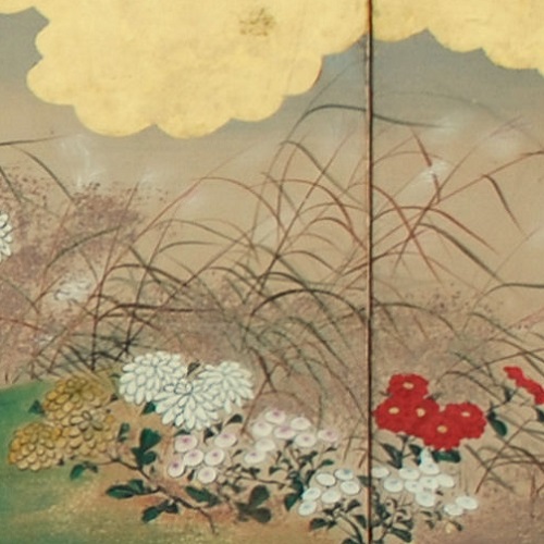 Antique Japanese six panel folding screen (byōbu) in sumi ink and mineral colors on gold leaf applied paper, with mixed metal flecks (sunago), mounted on wooden frames with paper hinges, textile border and lacquered molding, depicting a field of multicolored chrysanthemums (kiku), morning glories (asagao), blue Chinese bellflowers (kikyo), agrimony (fujibakama) and pampas grass (susuki), viewed through golden clouds. Sealed: Reishuu Origin: Japan Period: Edo/Meiji, Mid 19th Century Lower Seal: Reishuu; Upper Seal: Not Legible Dimensions: 31.0 inches high x 96.0 inches wide Painting 4129 |